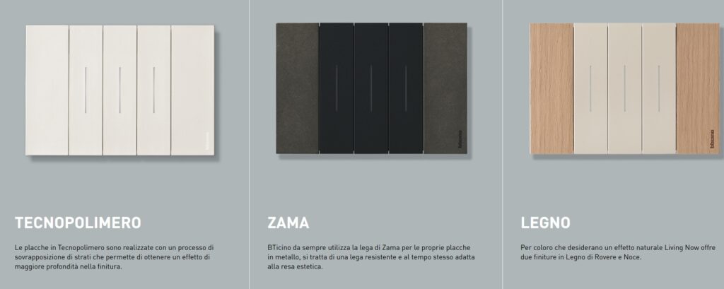 La gamma Living Now è disponibile in diverse finiture e colori, permettendo una personalizzazione completa per soddisfare ogni esigenza stilistica. Inoltre, la serie è compatibile con le soluzioni smart home, per consentire il controllo intelligente dell’illuminazione e degli altri dispositivi elettrici della casa.